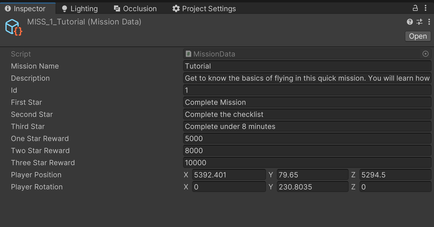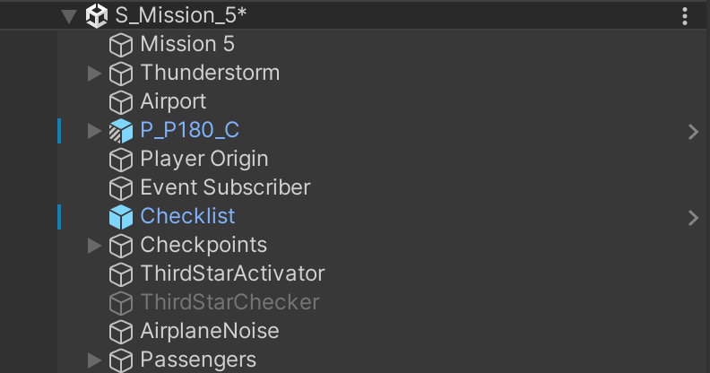 Missions: Missions are created using an event-based approach. A mother class called Mission was created and handled all the stuff related to get a mission loading, placing the player at the correct position, spawning the correct airplane, finishing and clearing the mission. Then for each individual mission a child class was made to add mission logic, ex. showing tutorial prompts, receiving trigger events, checking the star rating for the mission, changing airplane aerodynamics based on weather, adding timers, etc. Most of the functions on the mission class were bind to a trigger box inside the level. For example, each checkpoint fired events to enable the checkpoint and communicate with the mission in case especial actions were required. All of the data for each mission like name, task for each start, dialogs, etc, were stored in a scriptable object. Before the missions were implemented, a separate document was created to write the story and gameplay of each mission, although they changed a bit during actual development. Link to mission design document