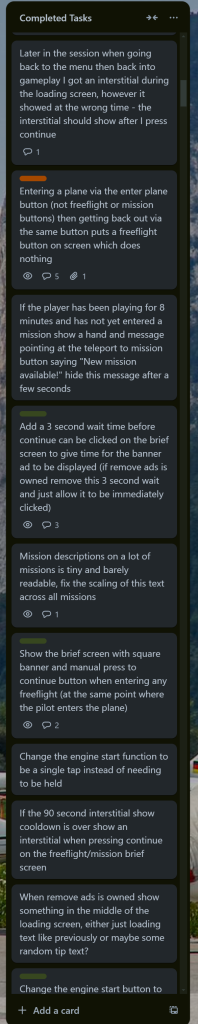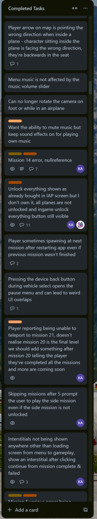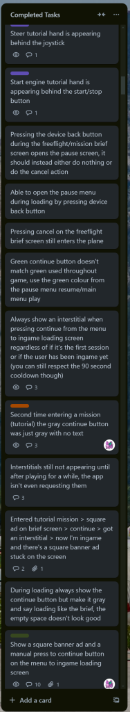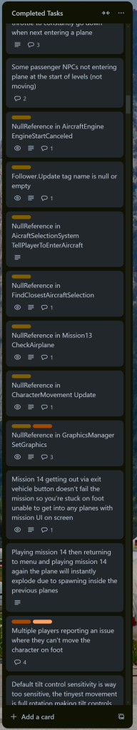 Project Finalization: After the core mechanic of the game was finished, a lot of adjustments had to be made to improve user experience by adding little details like guides for operating the airplane, teleporting player to the next av available mission, improving the design of missions, etc. Trello was the main project management software used for this game. Below are some of the tasks defined in the Trello board.
