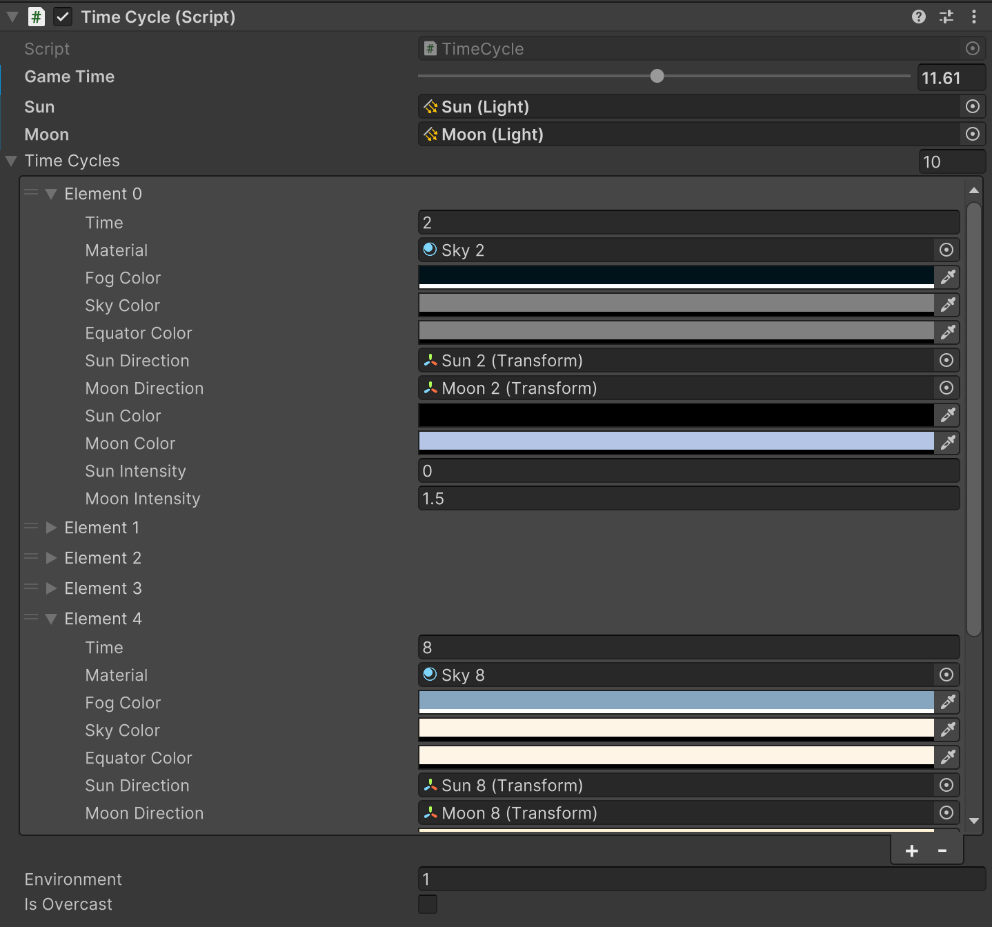 Lighting and game feel: The game features real-time day-night cycle with 24 minutes in real life equal to 24 hours in game. The system used multiple sky materials for each time of day, as well as different fog color and ambient color. The sun and moon also changed their position in sky and they would get bigger or smaller based on their position. The script for blending all these parameters for creating a seamless had to be optimized to run only one in a second, and to also break down the task into multiple frames. Fog was added to limit the distance player could see; this would give the player a tendency to explore the world by flying to each location. It also gives the illusion that world is bigger than what they think. To blend the fog with horizon, a hollow cylinder with inverted normals follows the camera, this makes sure the fog is applied up to the horizon and world would not like its floating on the air. Two layers of clouds were added at different heights to transfer the feeling of increasing altitude to player. During the day birds sound plays in jungles and at night there is owl sound. With the addition of wind and ocean sound the experience became more immersive. Also, there are NPC ships, boats and airplanes.