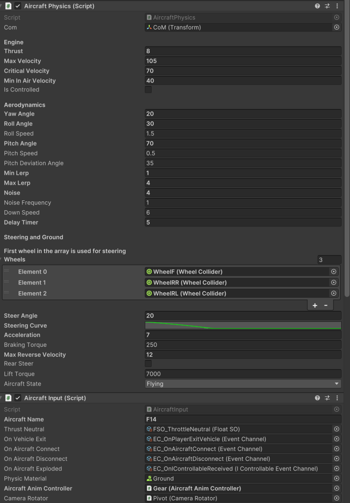 Character & Inputs: Character controller uses the default controller from unity. Character has the ability to enter and exit out of airplanes. For the input system, unity’s new input system was used to map inputs to actions. Controllable game-objects derived from an interface that had two functions for connecting and disconnecting from the input. the PlayerInput and AircraftInput class derived from IControllable, were responsible for connecting the CharacterMovement class and AircraftPhysics class to the input system in the overridden functions. There is a singleton class which holds the current IControllable instance, if a new instance wants to connect to the input system the previous one will be disconnected in the setter of the variable. This system ensured only one object received input during the gameplay and the transition between character and airplanes is without hinderance.