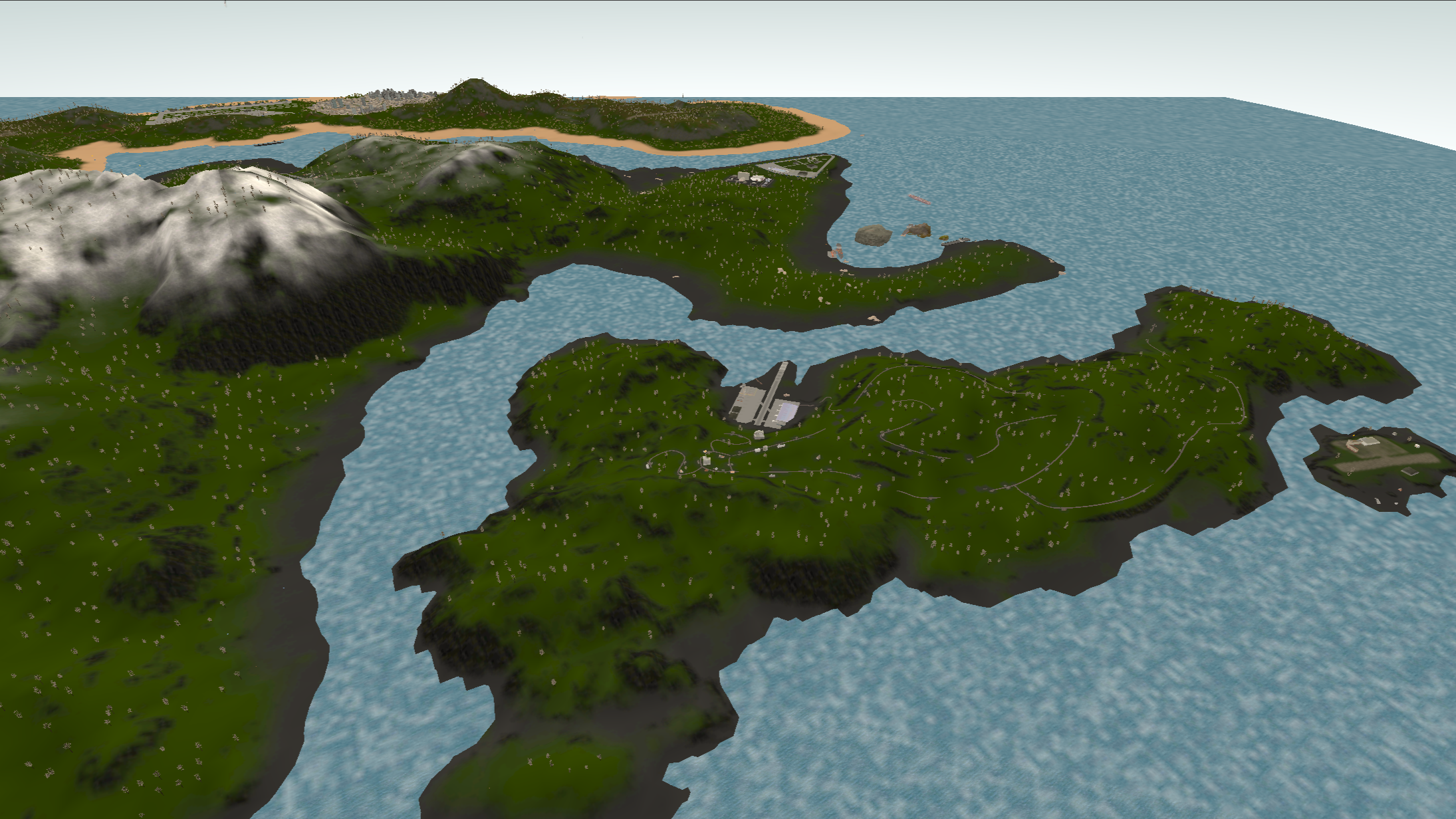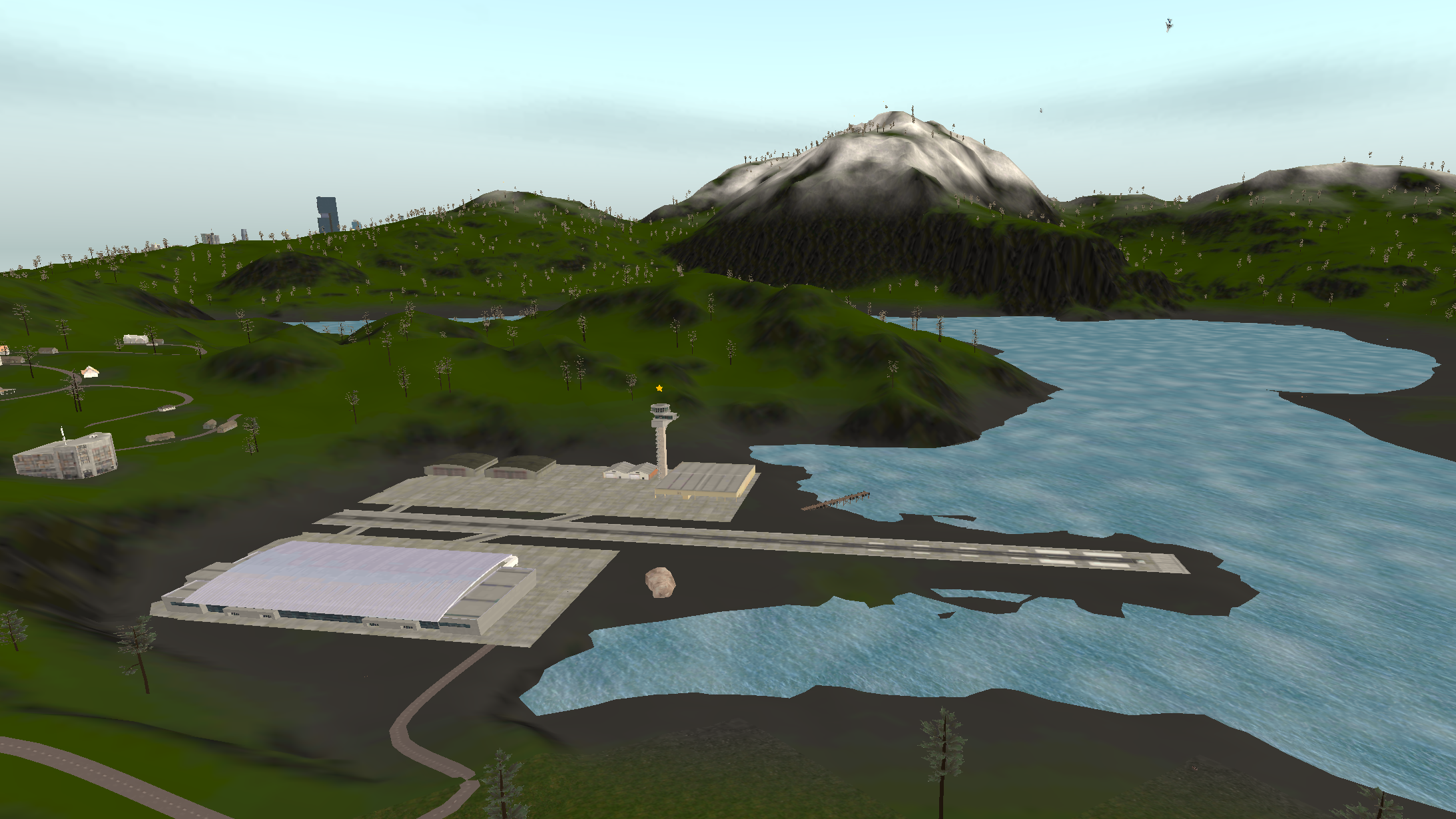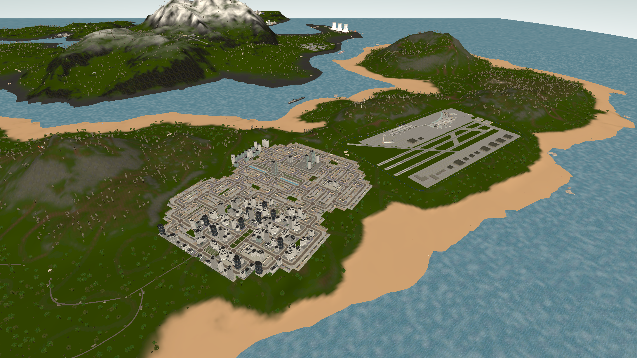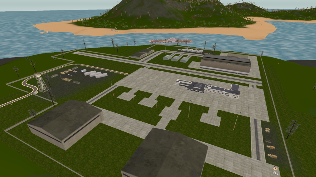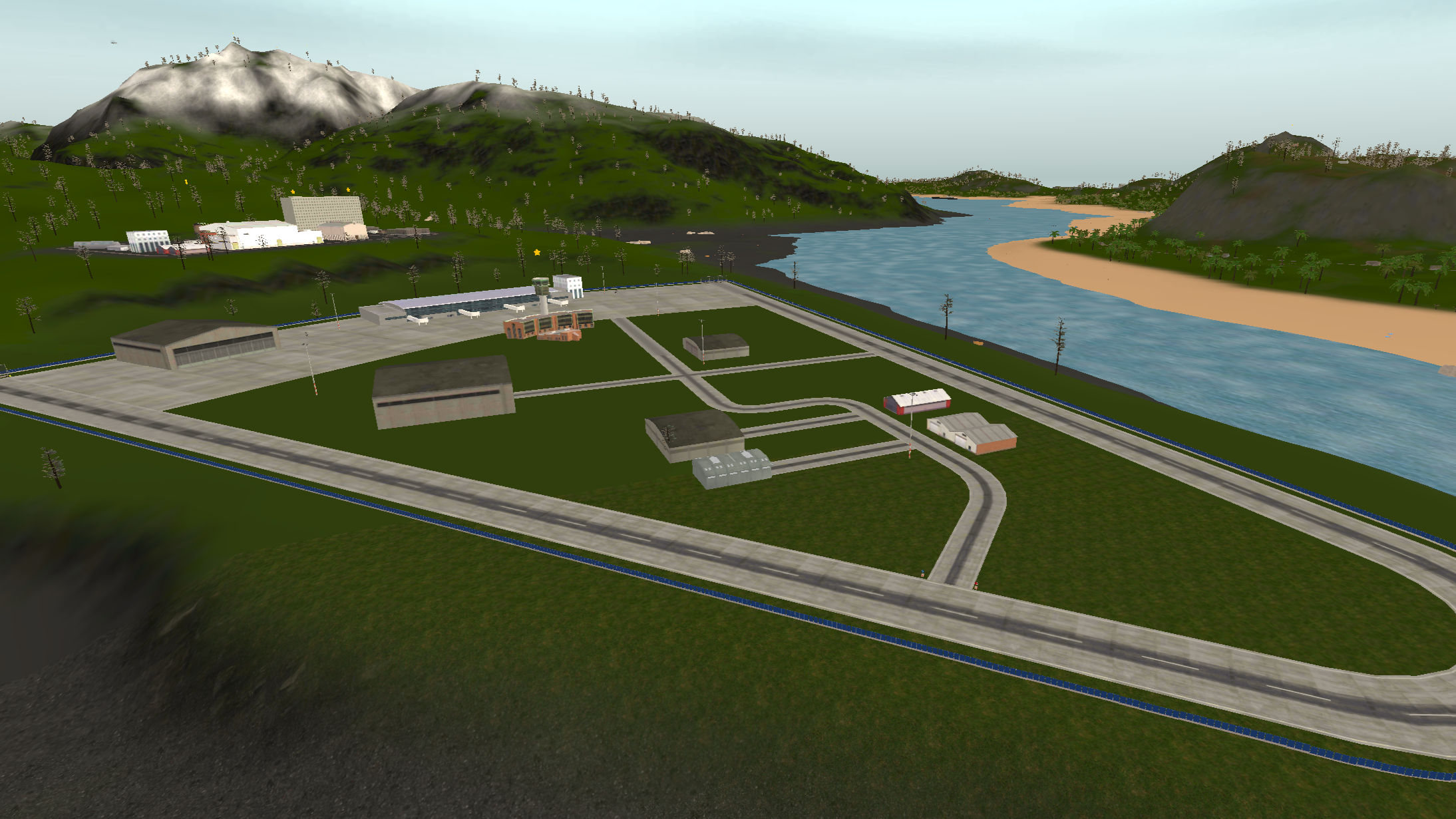 Island 2 is considerably larger than island 1, having a three-lane complex airport near a big city. There are two mountain ranges with one of them having a short dirt airfield on it and the other one having a military campsite. The road network almost covers all the landmass with buildings on the curbside.