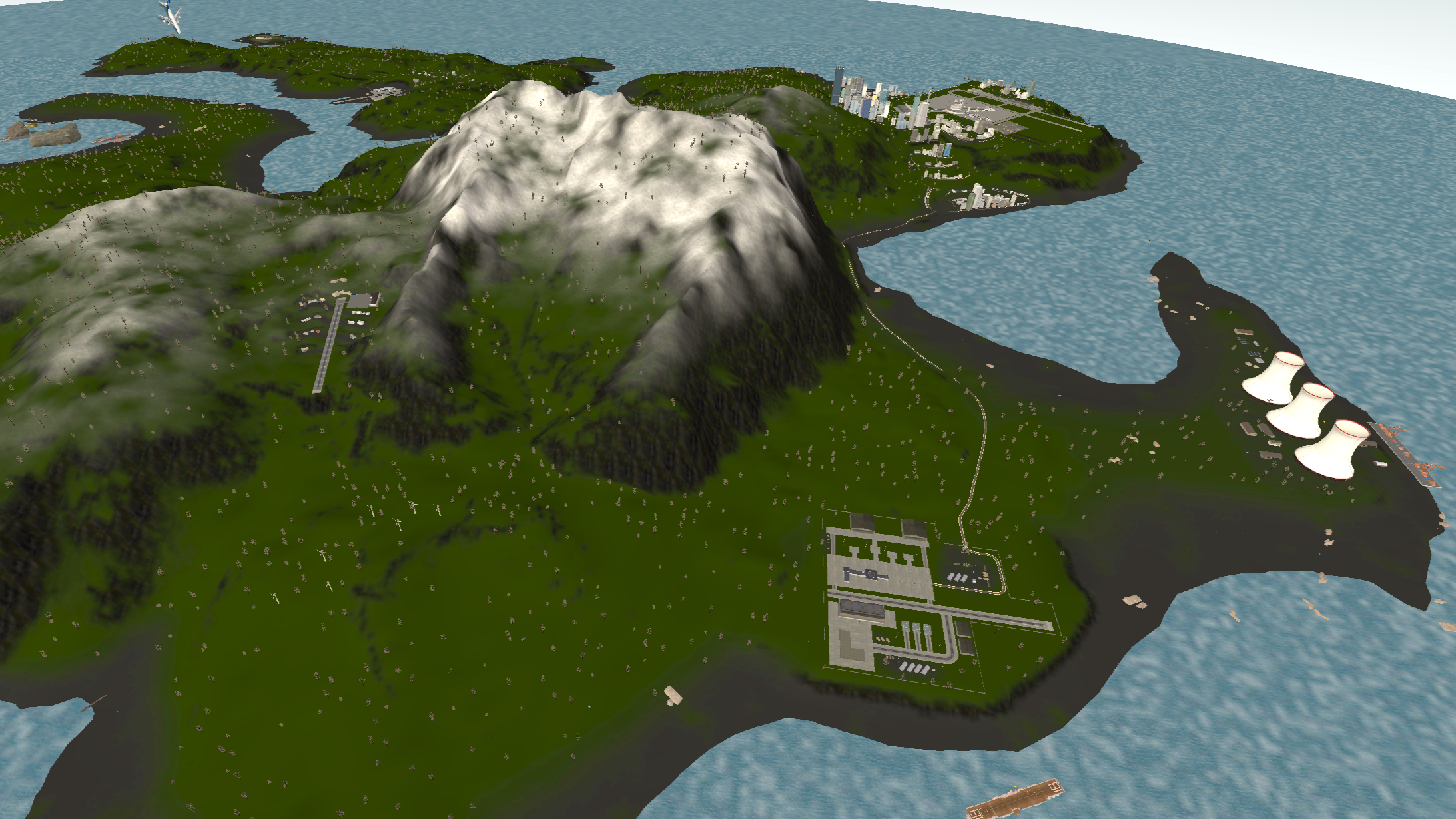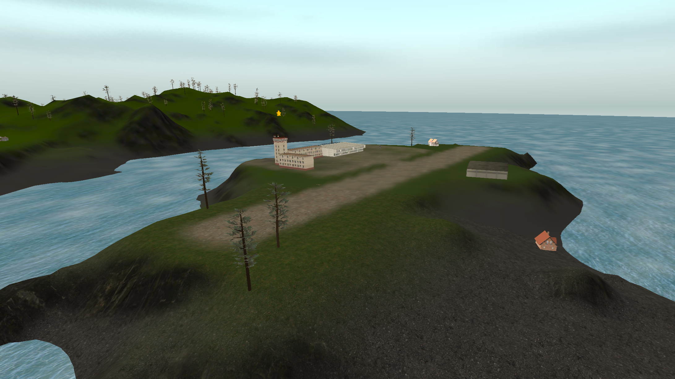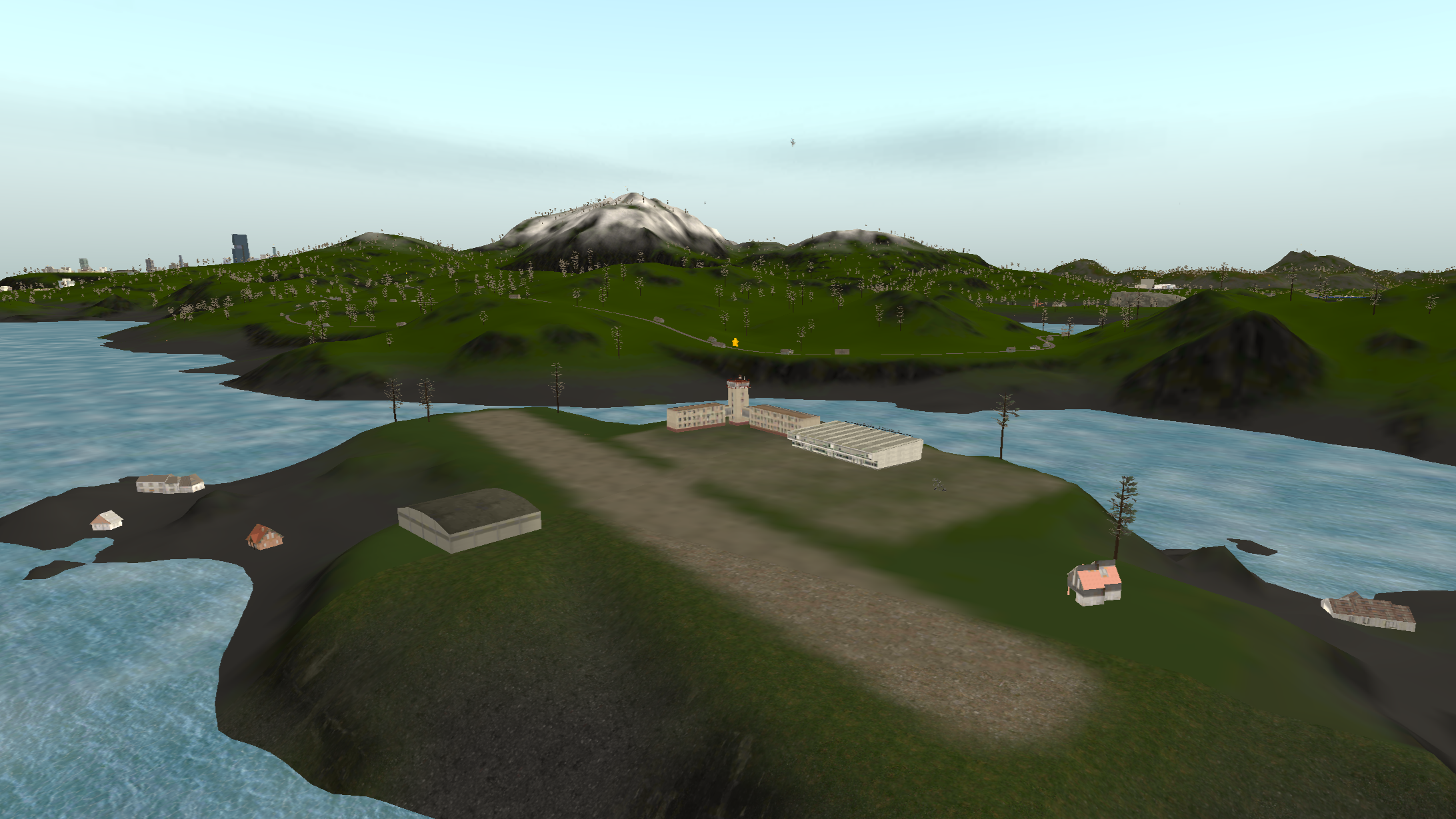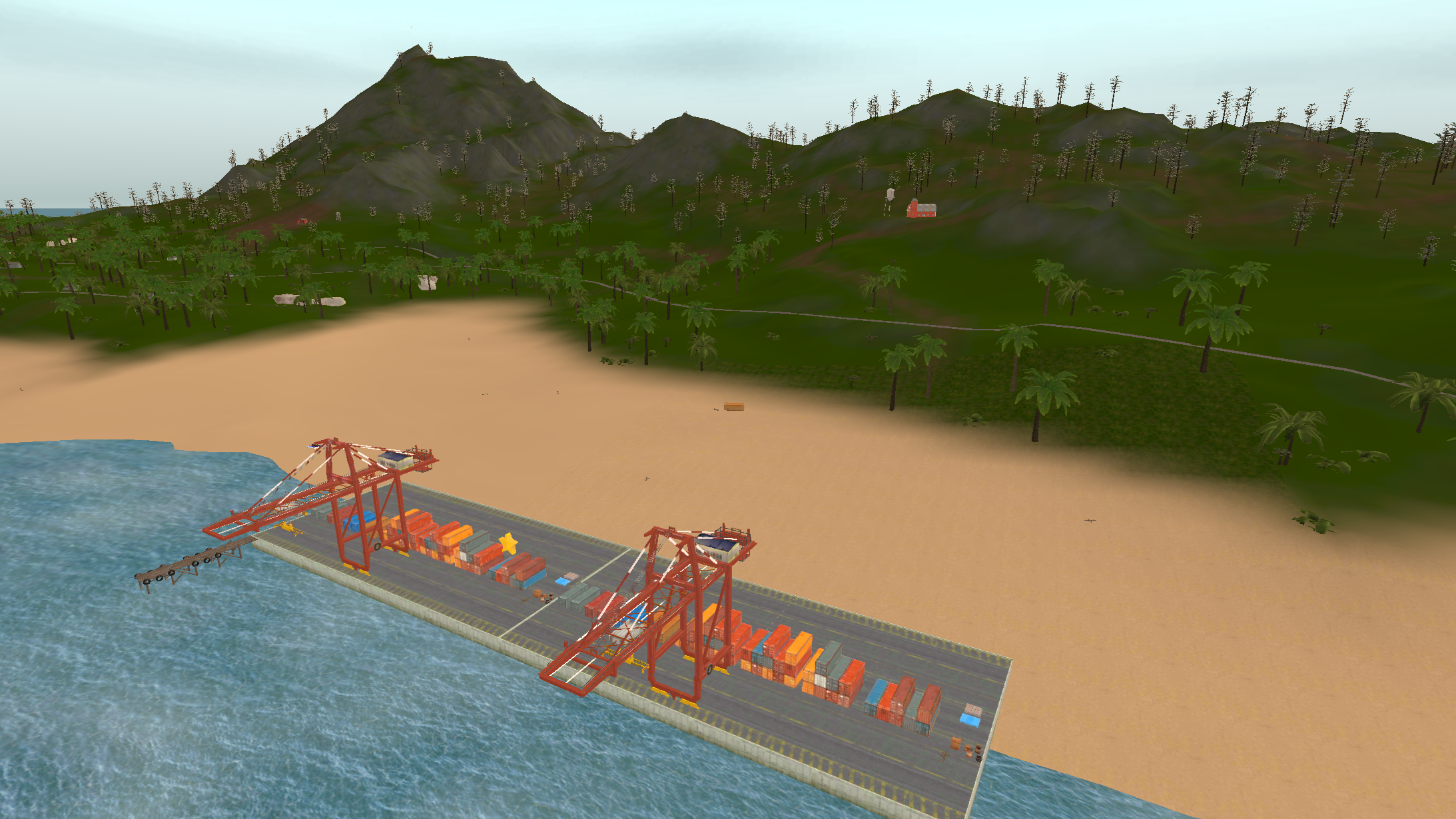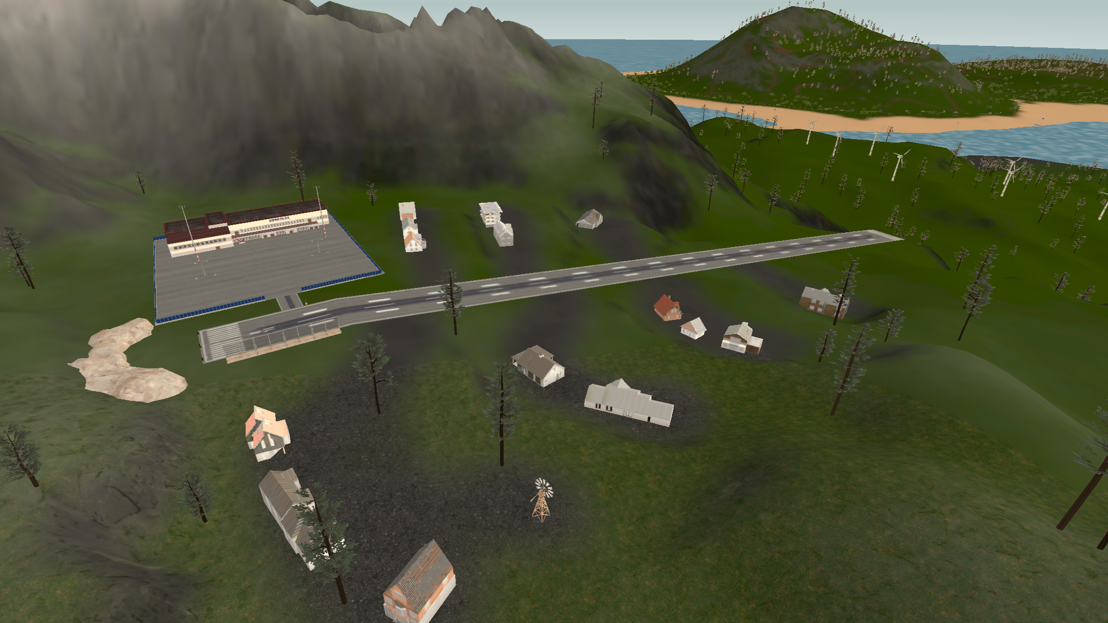 Island 2 is considerably larger than island 1, having a three-lane complex airport near a big city. There are two mountain ranges with one of them having a short dirt airfield on it and the other one having a military campsite. The road network almost covers all the landmass with buildings on the curbside.
