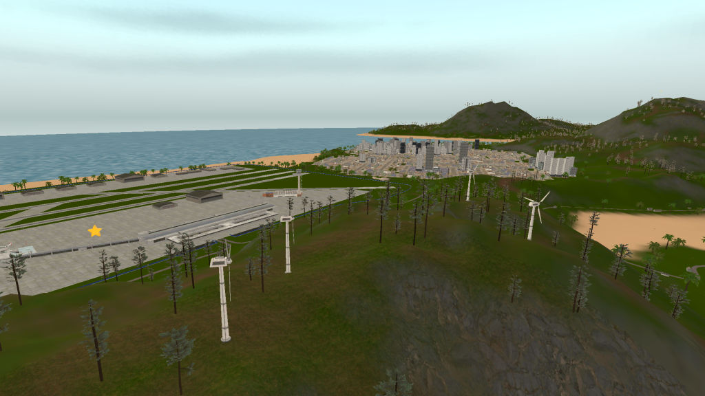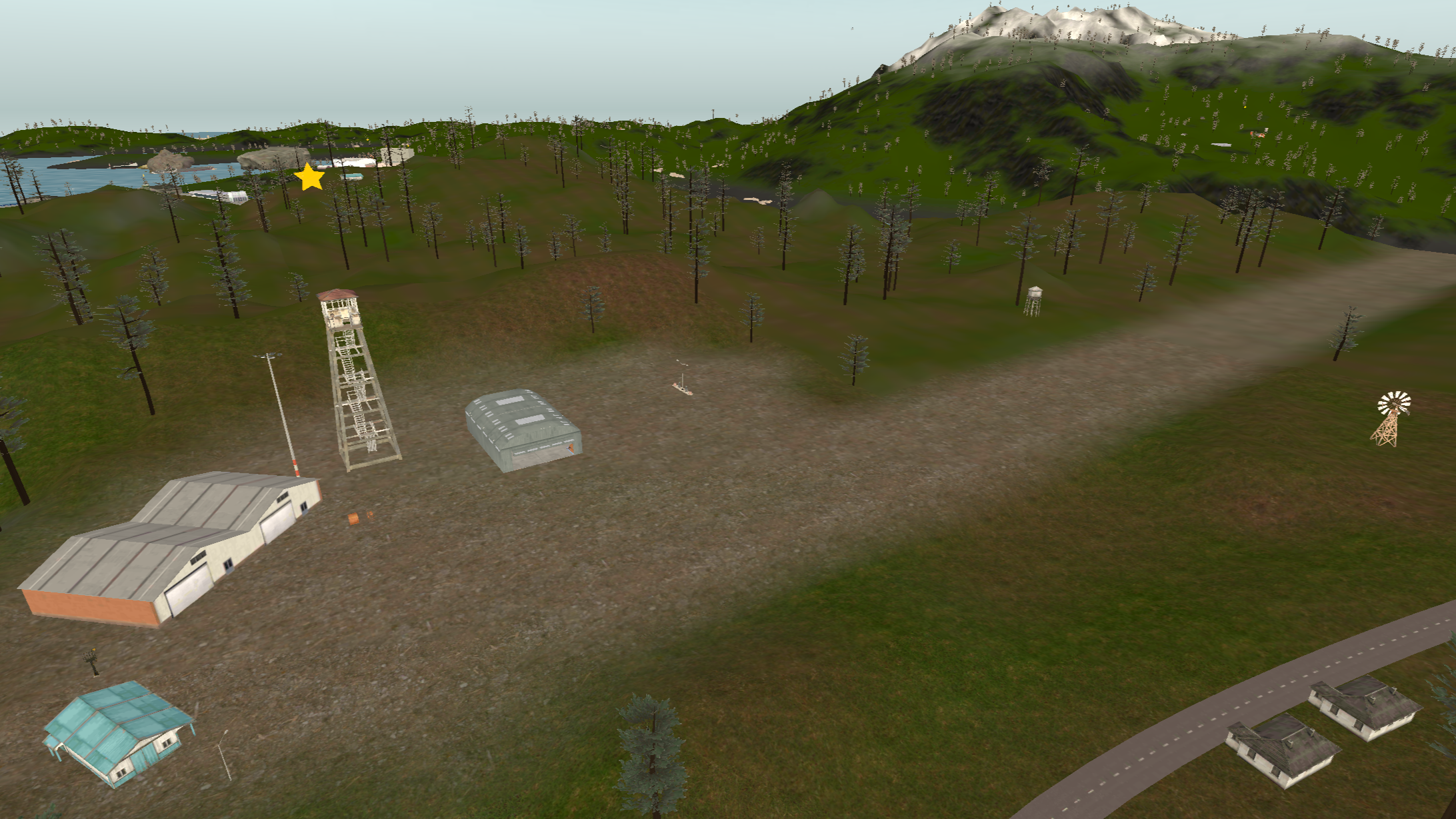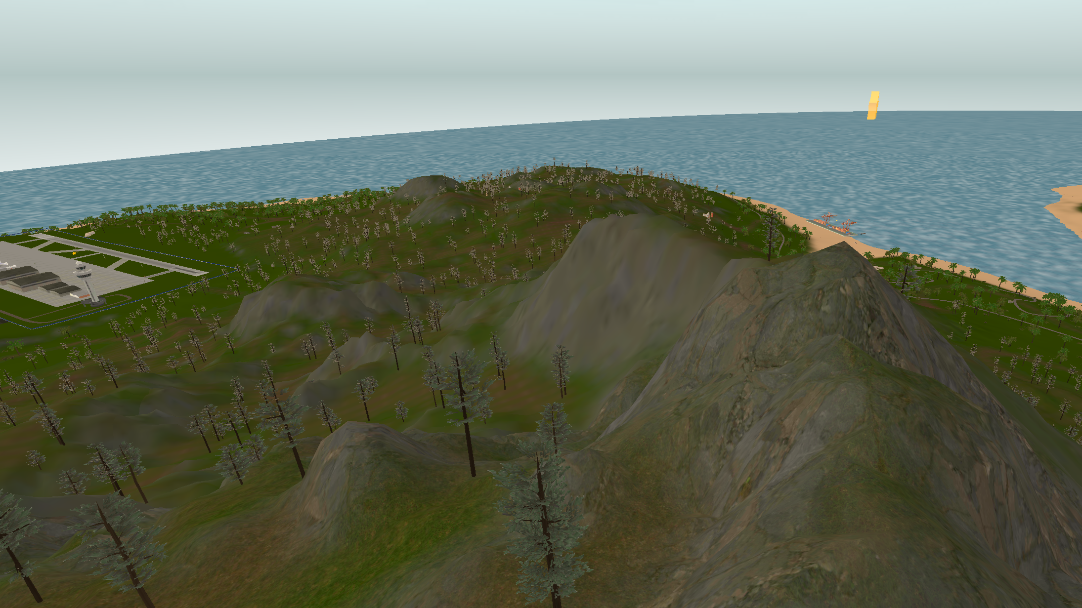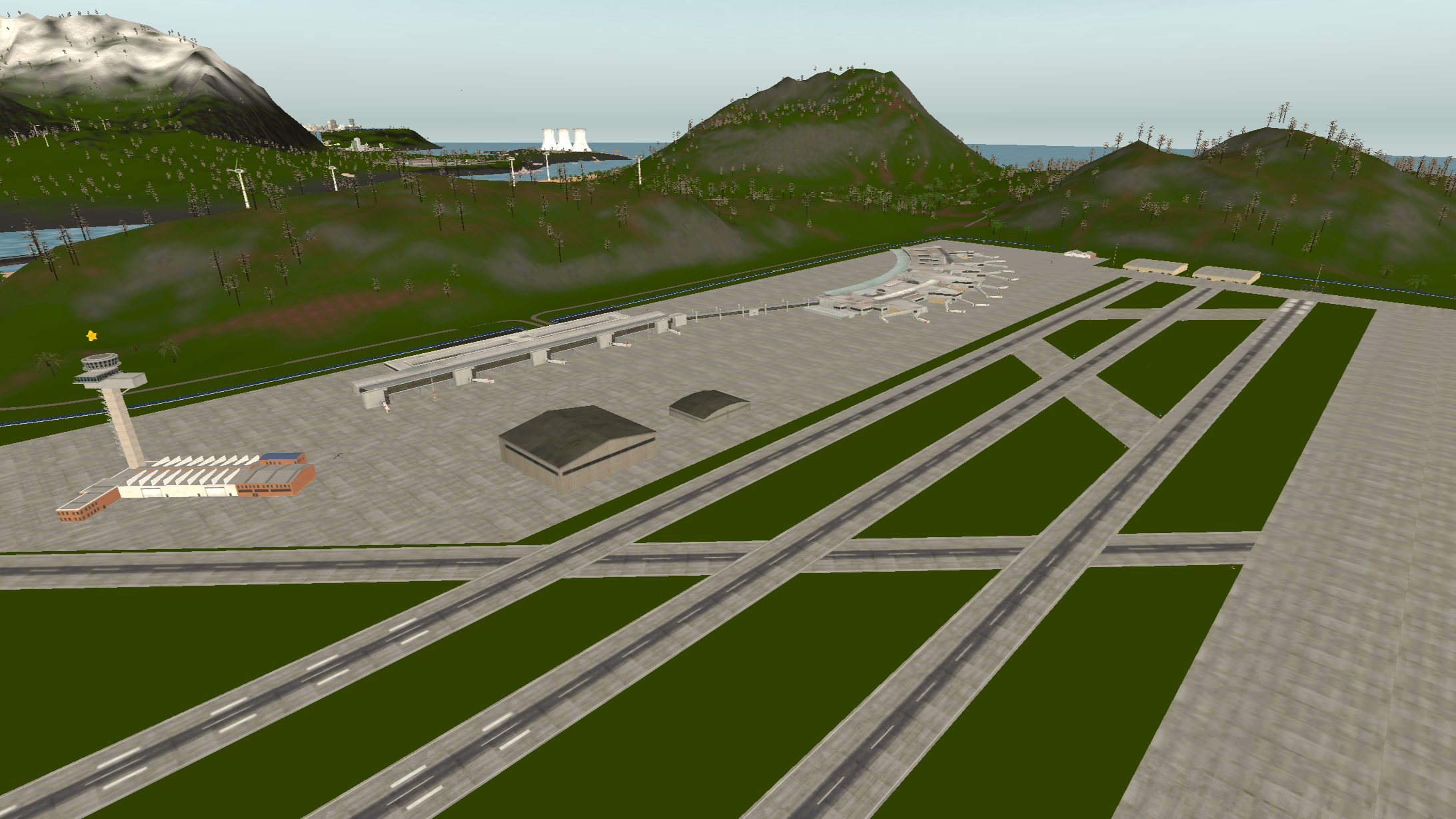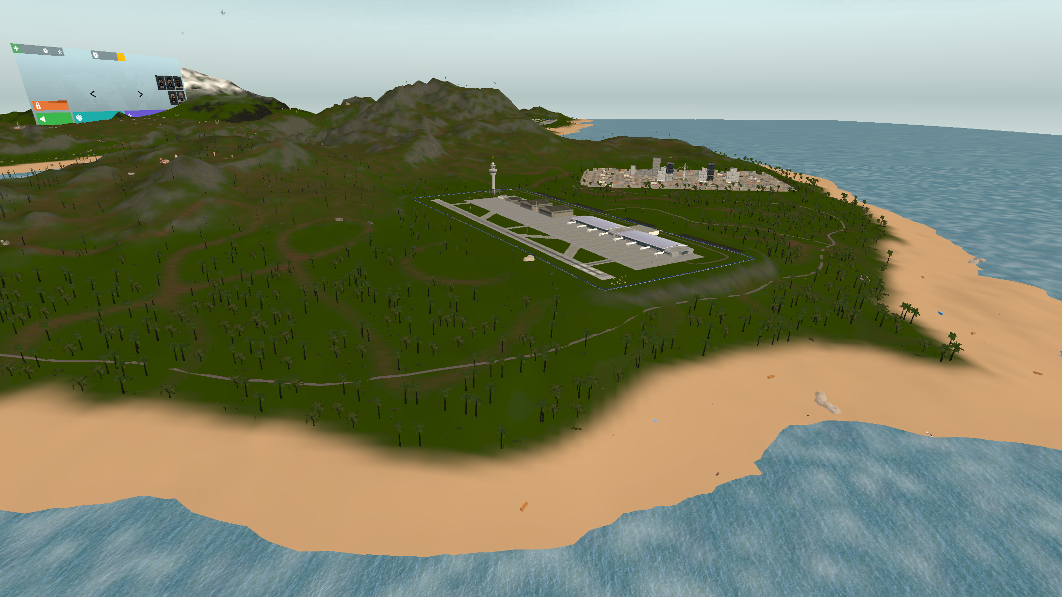 Island 2 is considerably larger than island 1, having a three-lane complex airport near a big city. There are two mountain ranges with one of them having a short dirt airfield on it and the other one having a military campsite. The road network almost covers all the landmass with buildings on the curbside.