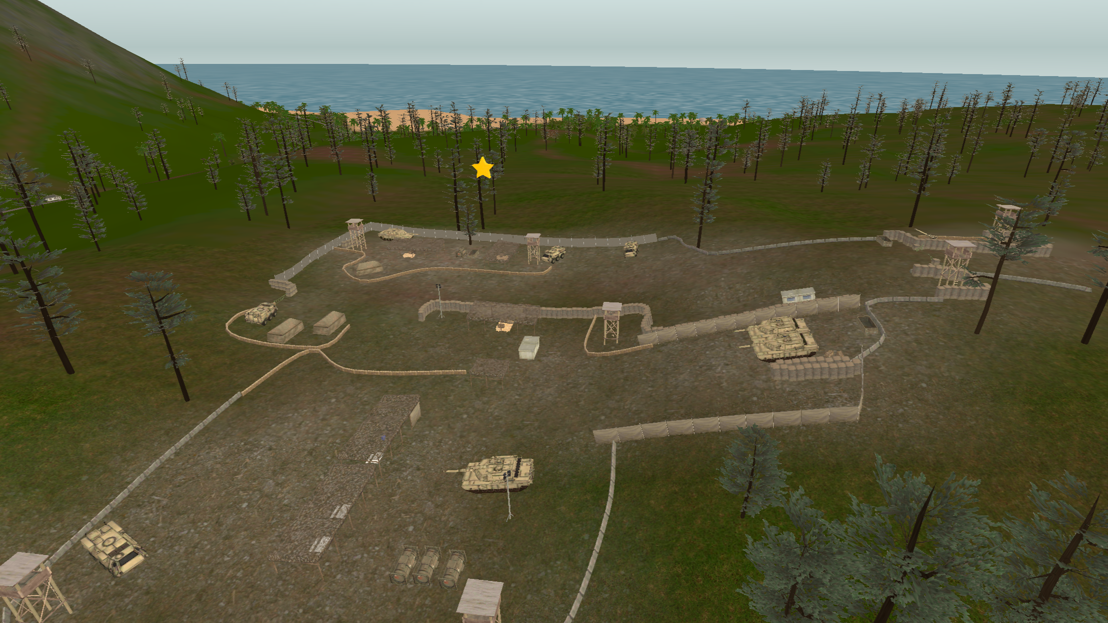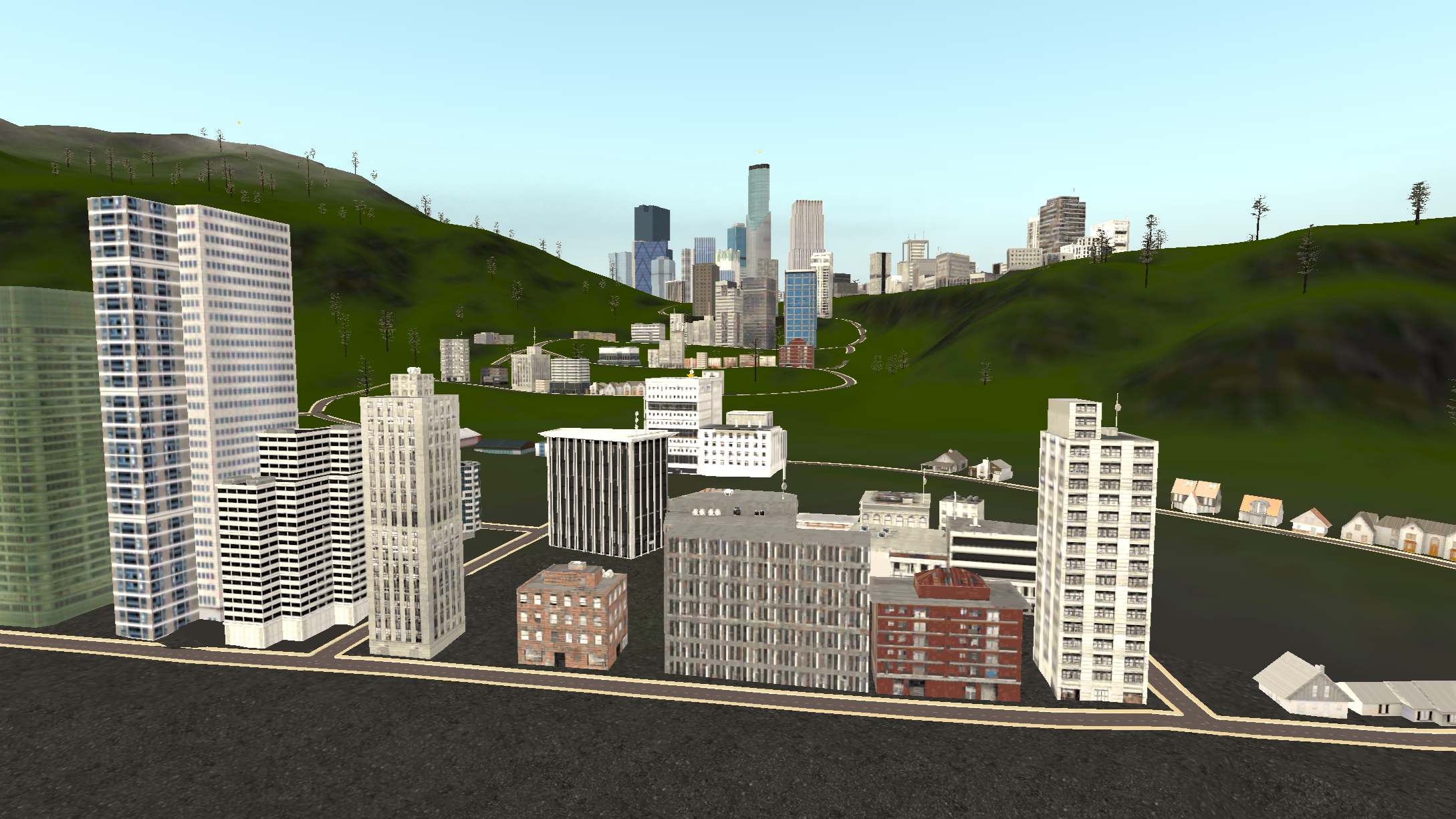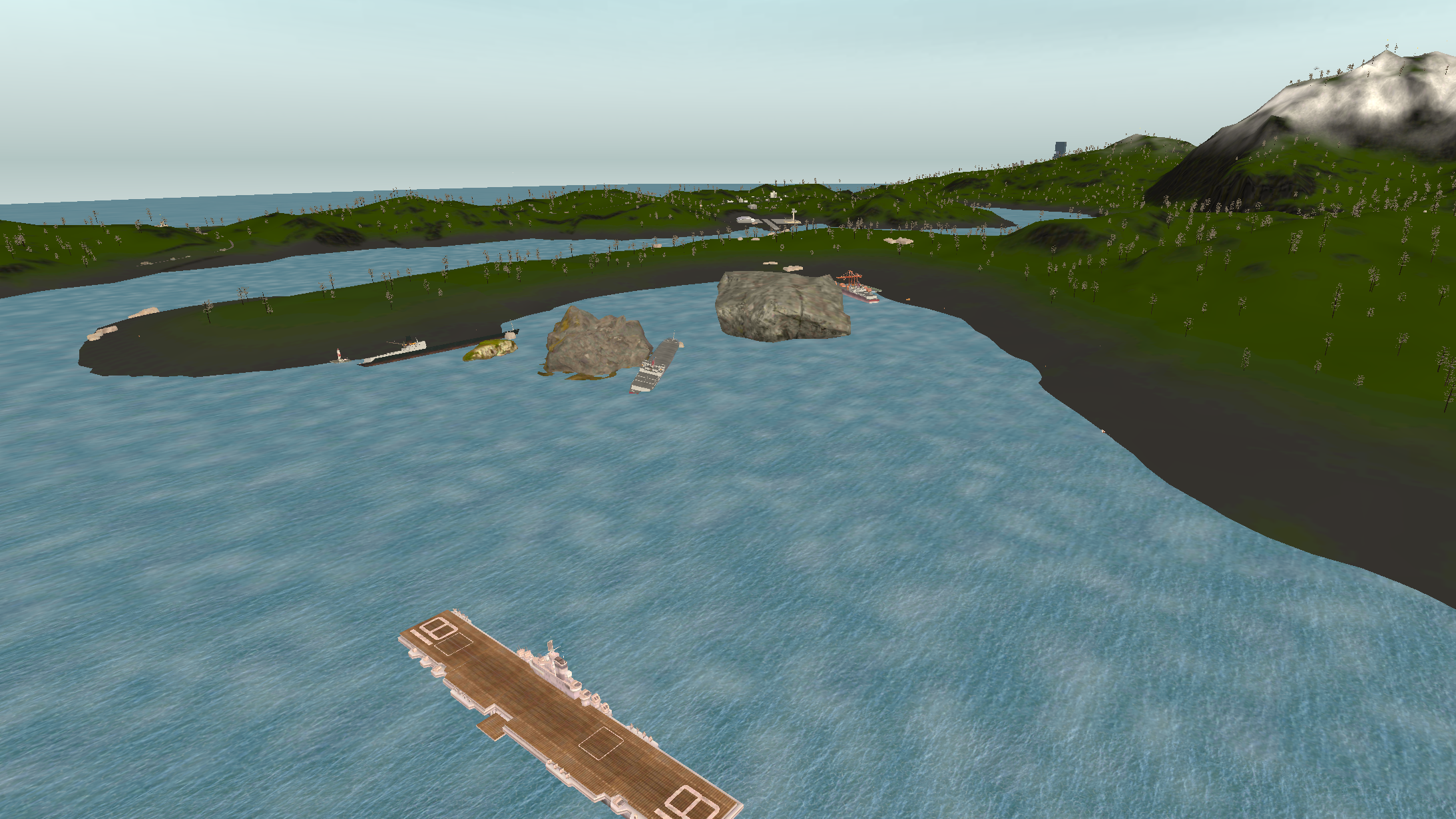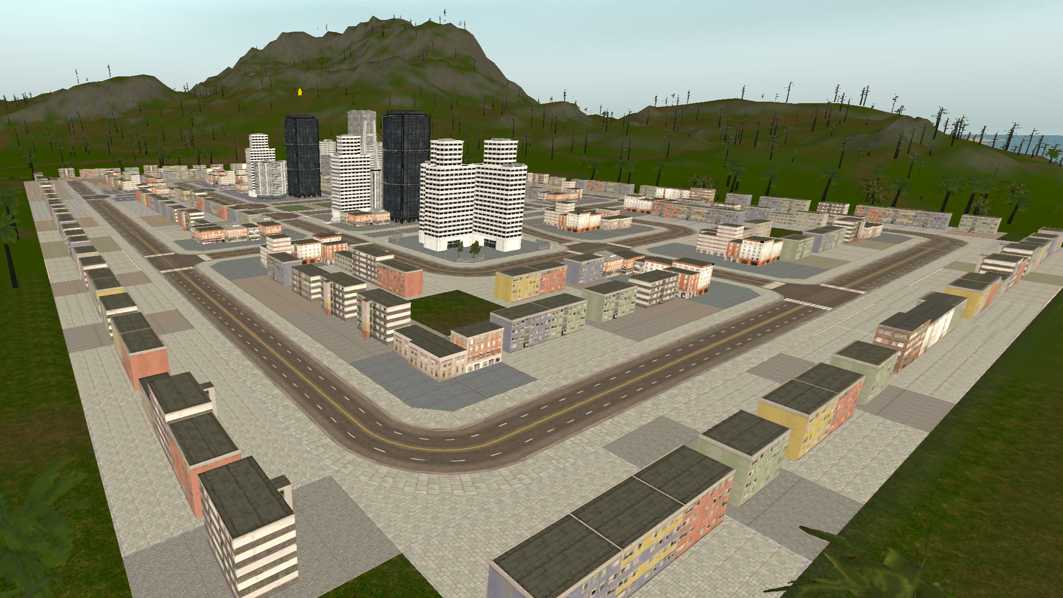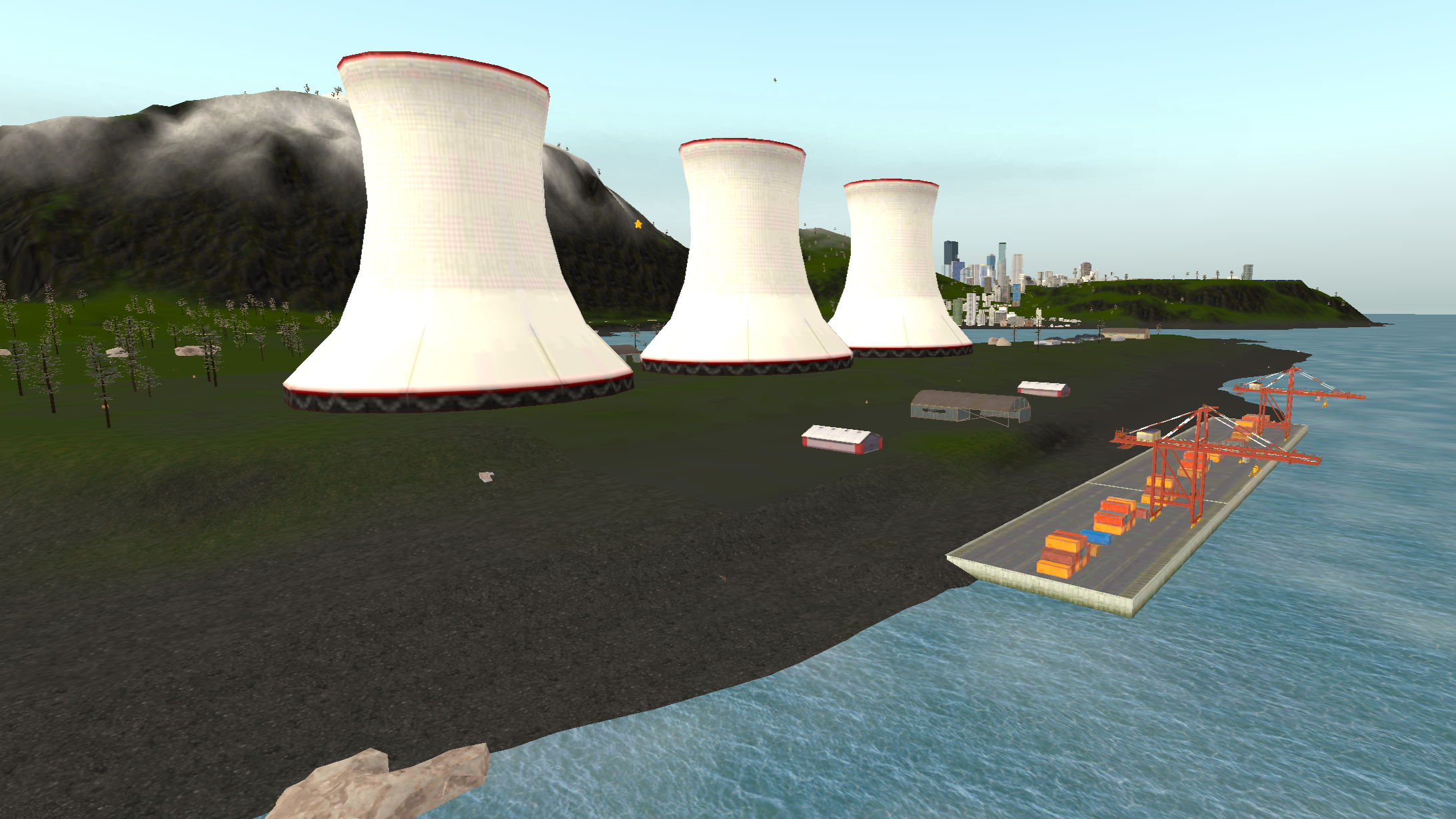 Island 2 is considerably larger than island 1, having a three-lane complex airport near a big city. There are two mountain ranges with one of them having a short dirt airfield on it and the other one having a military campsite. The road network almost covers all the landmass with buildings on the curbside.