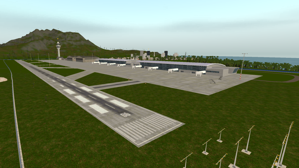 Island 1 has one main airport near a city, there is also a deck near water which gives access to select seaplanes. Road network connects airport to city and goes all the way around the island to the deck area, a small village and lighthouse.