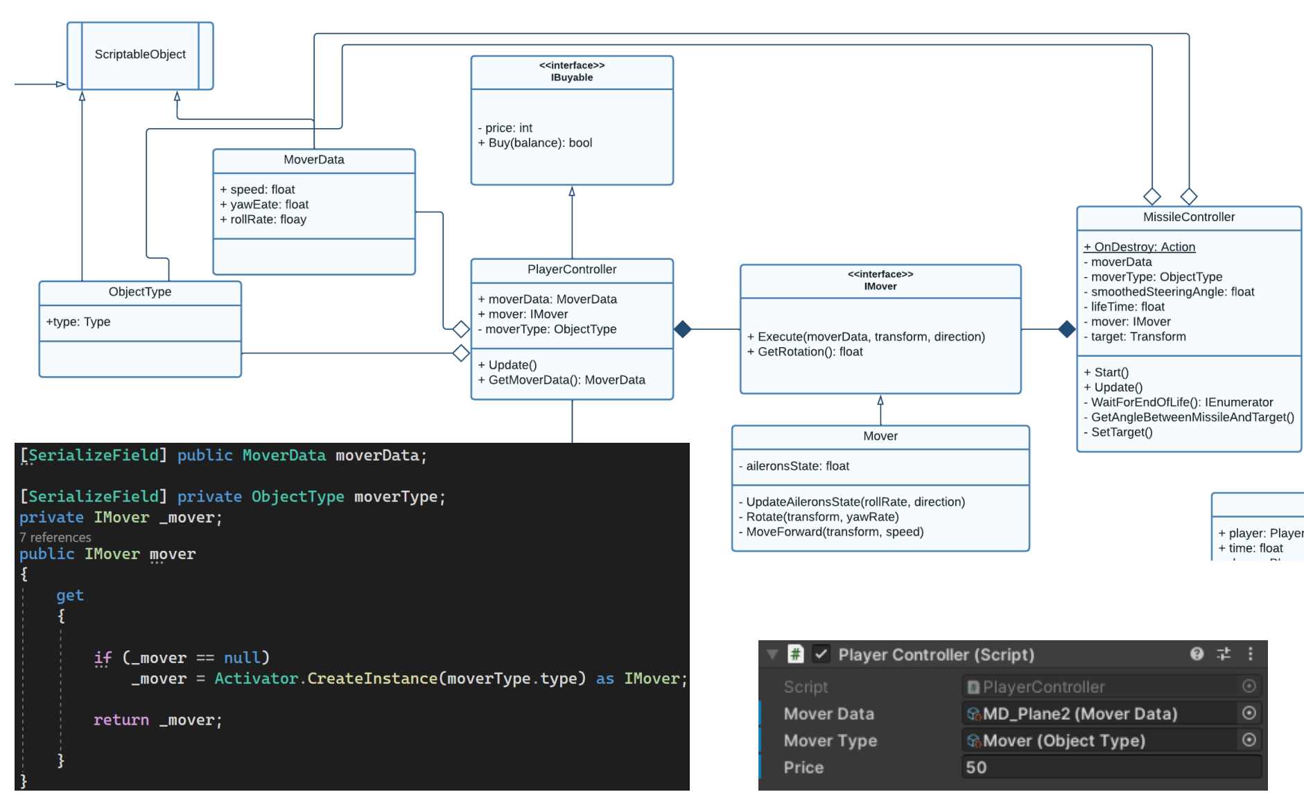 This part of the system shows the use of Unity’s Scriptable Object to create an asset that holds the type of class. This asset is then used in conjunction with strategy design pattern, which in our case is our Mover class.