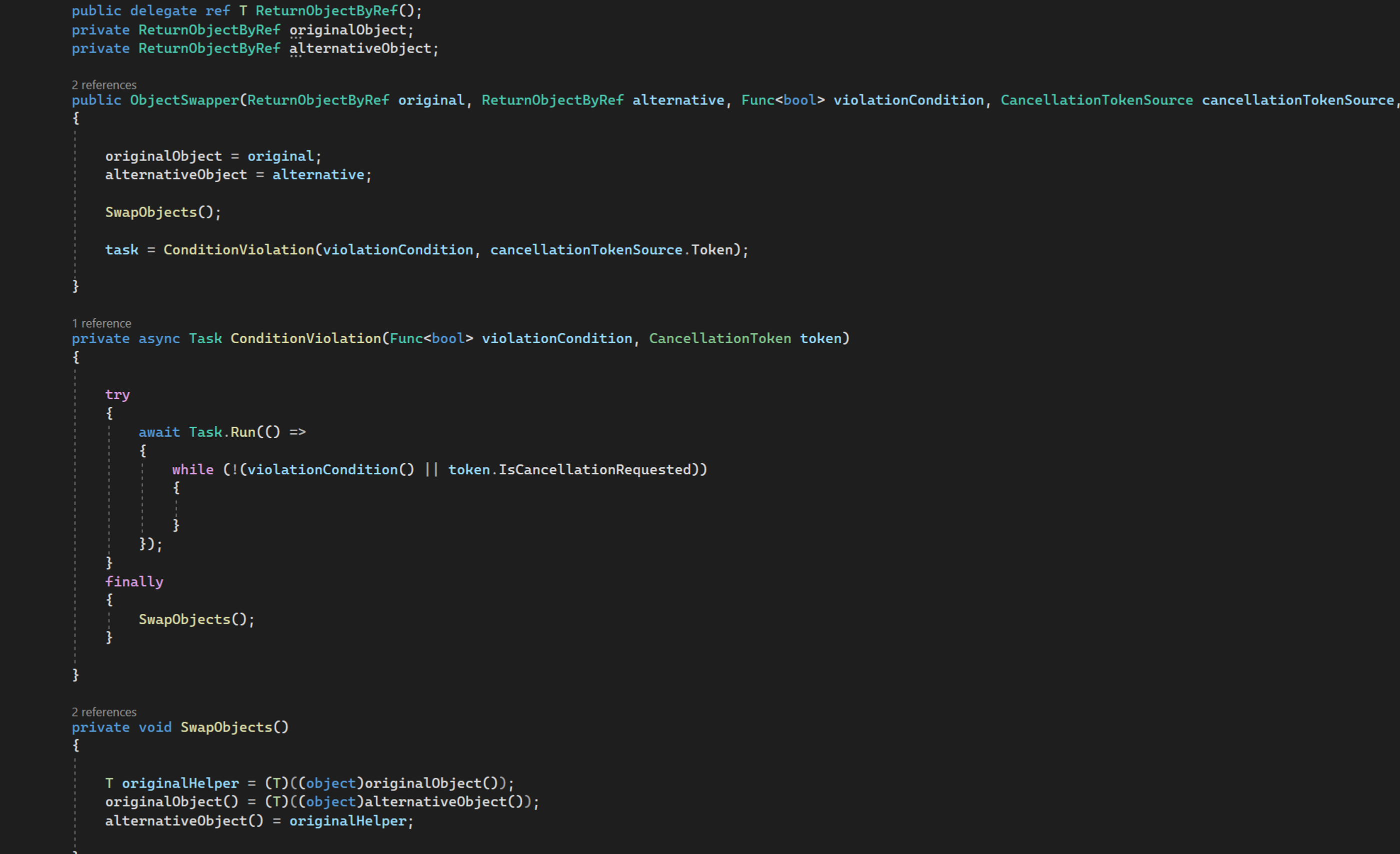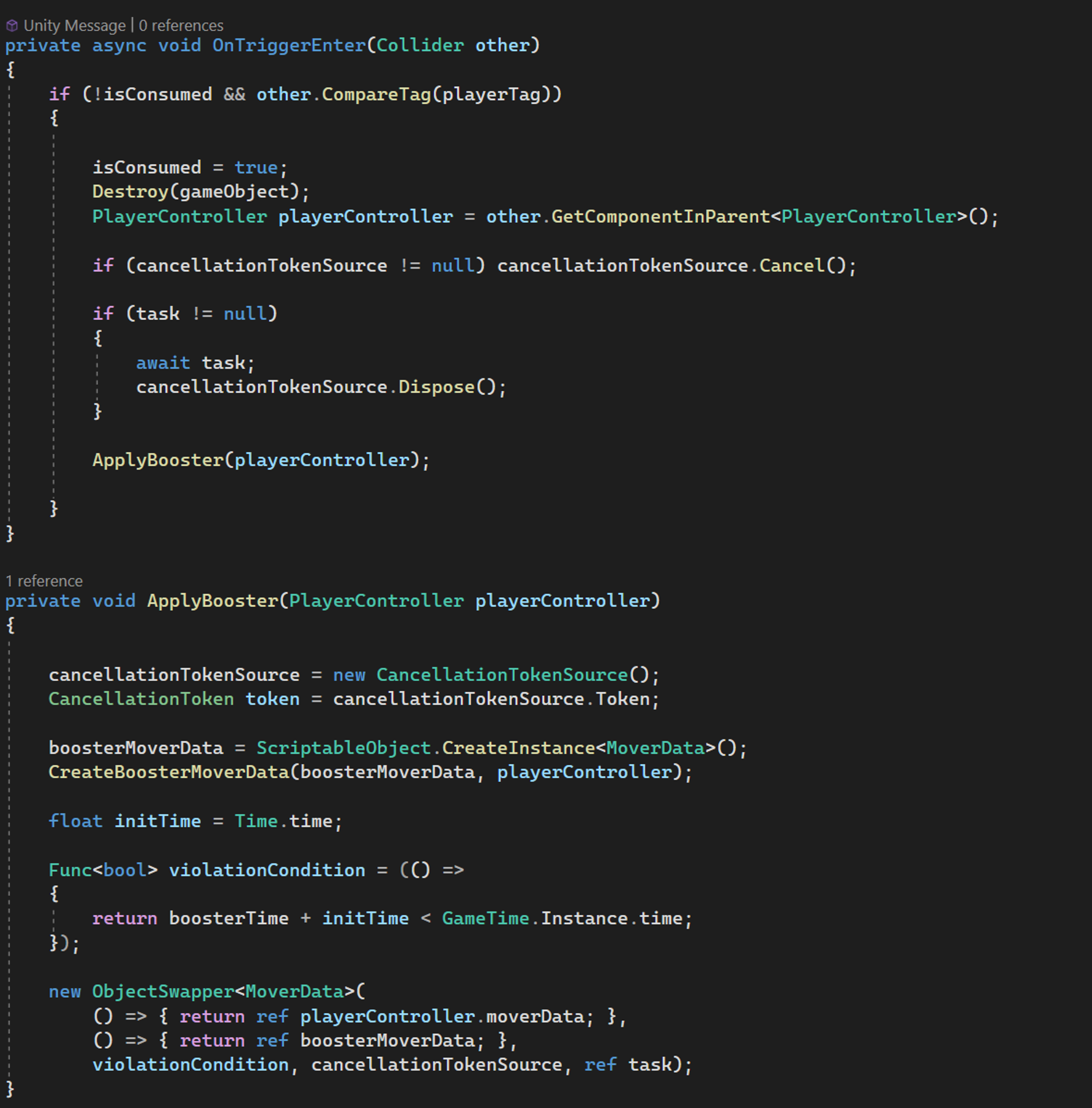This is the most challenging part of the code. I was looking for a way to swap two variables with each other for a designated time, then swap them back to their original values. One way would be to do this using unity’s Coroutine system. However, this had a problem. If the object running the code got destroyed, the Coroutine would no longer run since they are bound to the existence of Game Objects. To solve this issue, C# Tasks were used which would run until they were finished, regardless of the existence of the original object.